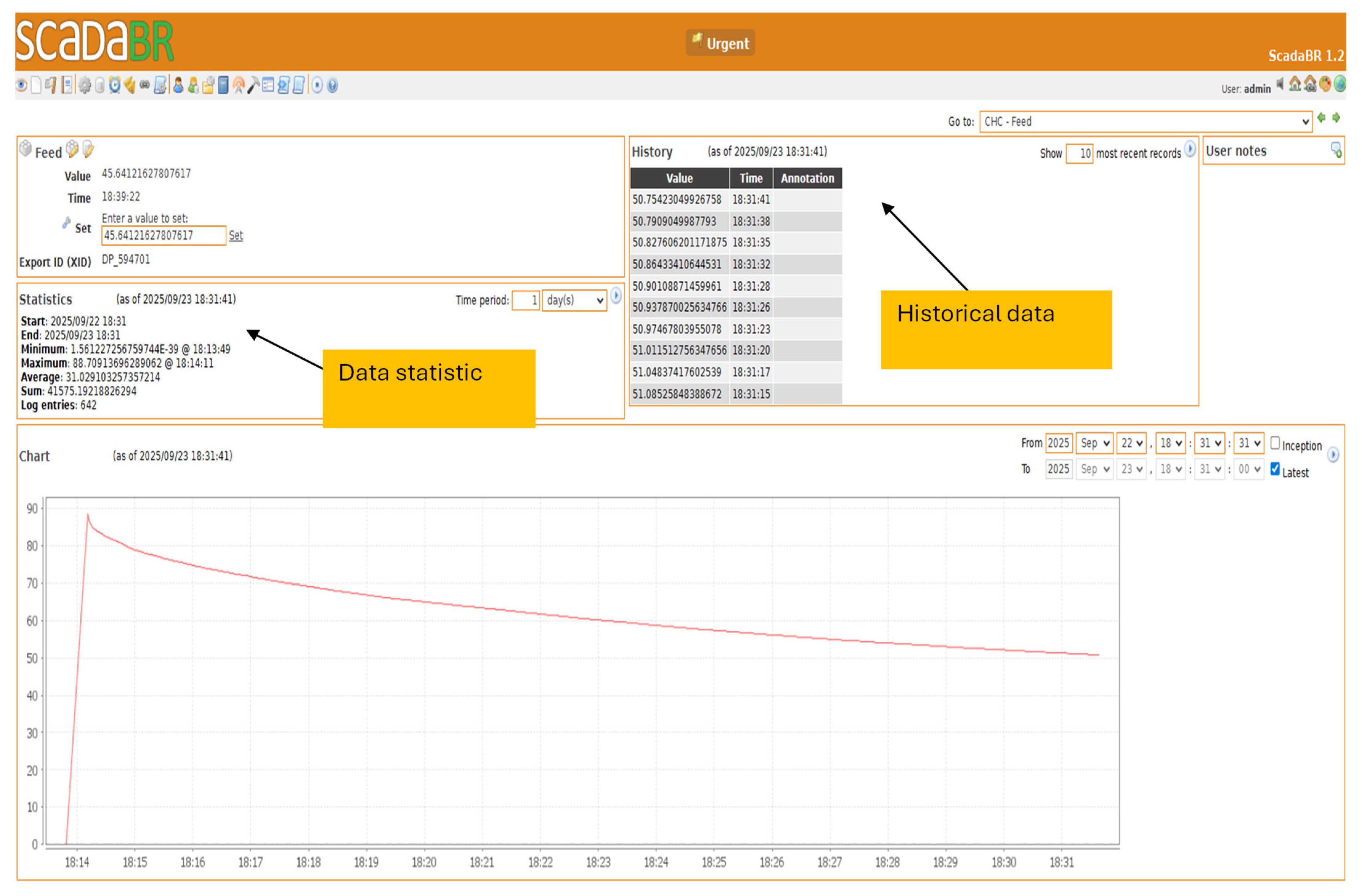 Although PyModbusTCP provides convenient Python-based interfaces for Modbus TCP communication, it can be subject to communication latency and error-handling limitations. A data quality verification routine was implemented at each communication cycle to detect exception errors and communication failures, thereby preventing the transmission of erroneous data to ScadaBR or the computational model. The routine attempts to retrieve data from client devices up to 10 times consecutively before transmission. If data acquisition fails after ten attempts, an alert is automatically issued to notify the user and facilitate the investigation of potential communication issues. During this period, system operation continues using the most recently validated data.