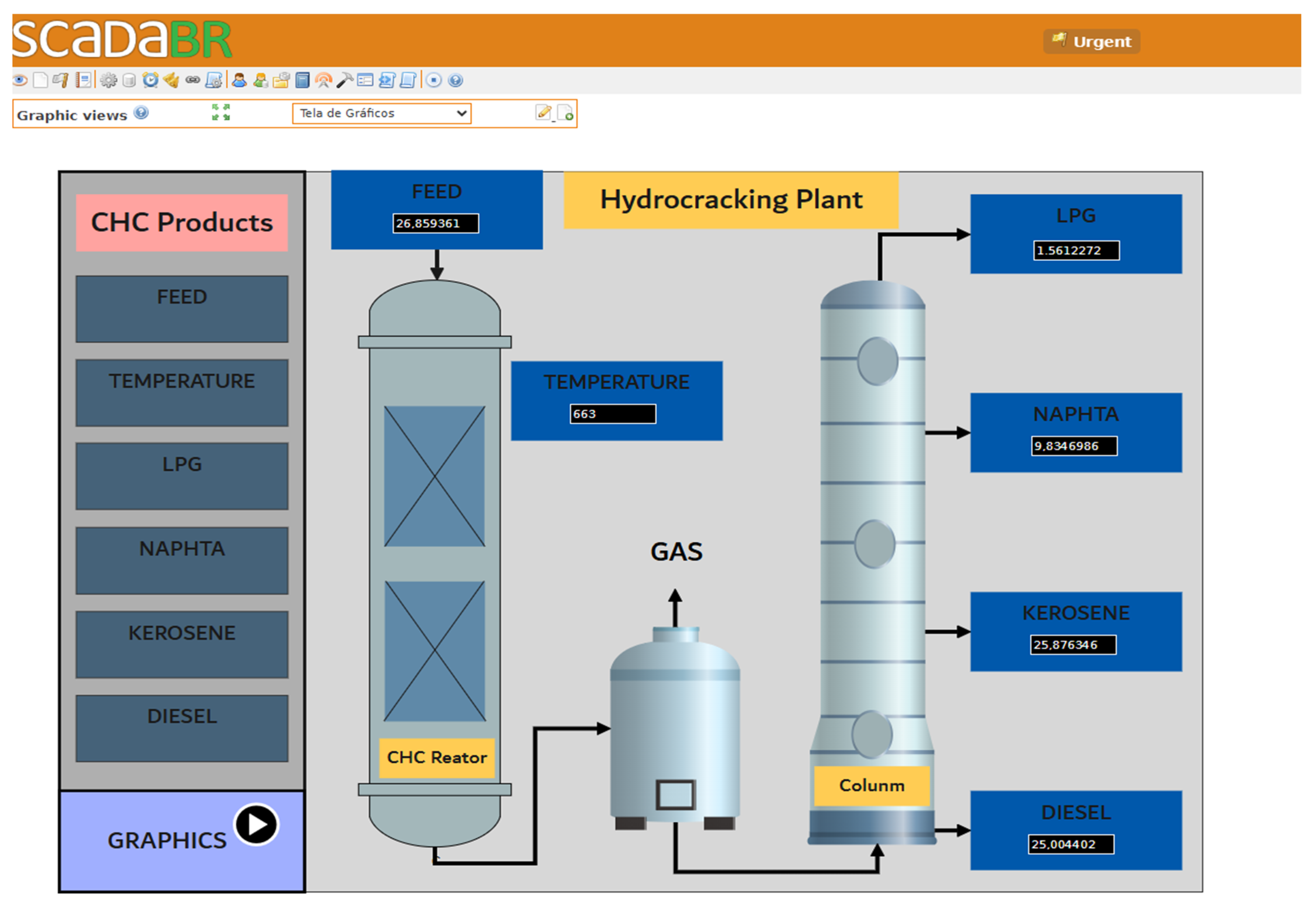 In the first case, a simplified dynamic kinetic model of a catalytic cracking process of VGO was developed in Python. This model simulates the evolution of the LPG, diesel, naphtha, and kerosene products along the reactor, with periodic updates to the SCADA system. The kinetic model has temperature as the independent variable, which can be adjusted via the ScadaBR dashboard. Tests showed that the ScadaBR system performed well, demonstrating stability and robustness in the communication and representation of its model.