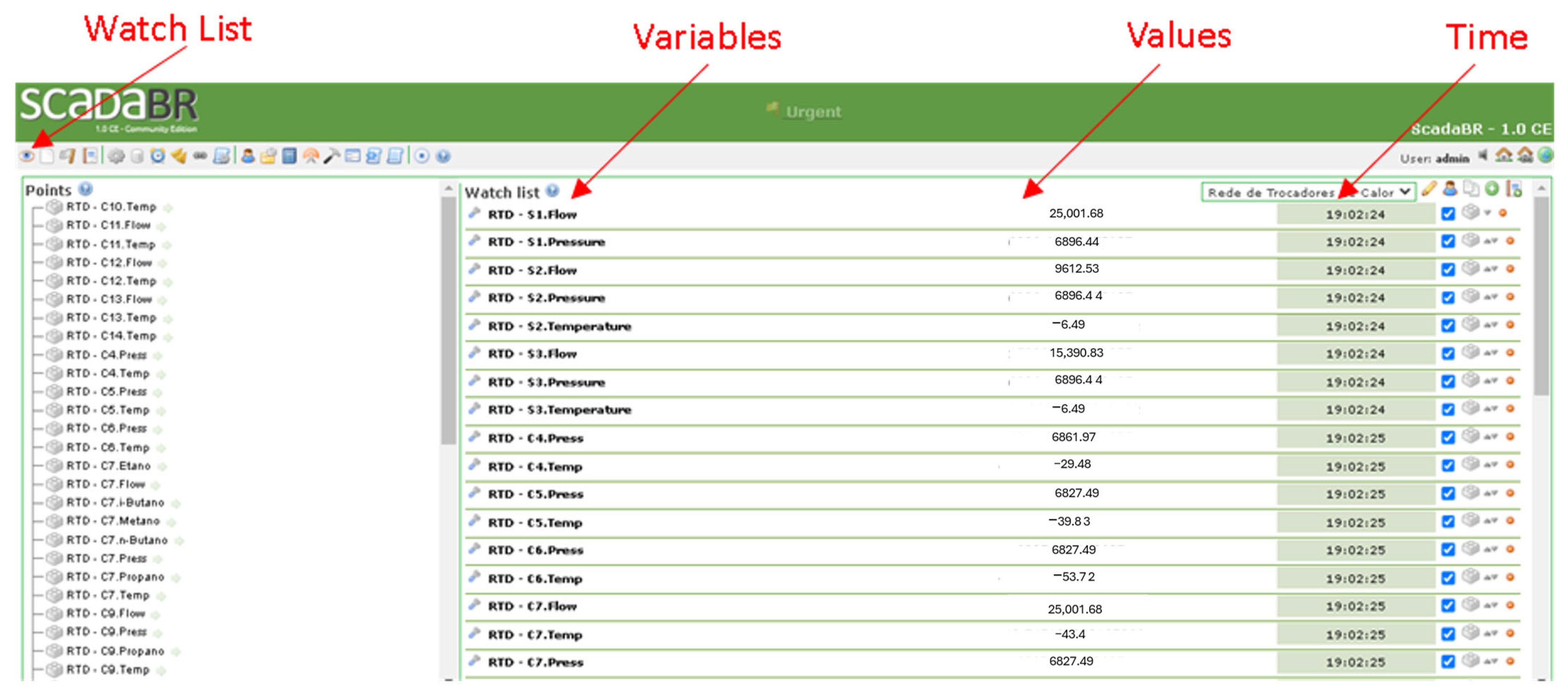 ScadaBR implementation: Each process variable is inserted into the ScadaBR (version 1.0) environment. Also, the dashboard is implemented, containing the process flowsheet of the modeled process and real-time graphics for monitoring the main process variables.