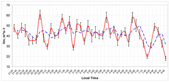 Change in the maximum wind speed in the TC, obtained by HLS approximation of radar images of spiral cloud-rain bands; the dashed blue curve is the result of moving average of point data over three points; local time from 21:20 to 23:15 refers to 23 July 1989, other time points refer to 24 July 1989.
