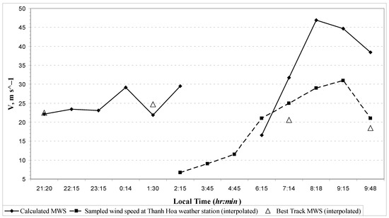 The calculated maximum surface wind from the combined radar–meteorological data was verified by comparing these results with the interpolated measured values of the surface wind at the Thanh Hoa weather station (Figure 3). The comparison was made with weather data corresponding to the position of the TC center near this meteorological station (dots 10 and 11 on the TC track, respectively; Figure 1) and with the Best Track data interpolated in time to the measuring time points also presented in Figure 3. The comparison shows that at approximately 6:45 LT (middle position between dots 10 and 11), the calculated maximum wind speed coincides with the measured one, when the maximum TC wind zone approximately covered the weather station. After this zone completely reaches the coast, the maximum wind speed in the TC begins to prevail over the wind speed measured at the weather station in proportion to the distance of the maximum wind zone from the weather station (dots 11–14). Both surface wind plots in Figure 3 show short-term secondary TC intensification over land between approximately 06:15 and 09:15 LT.
