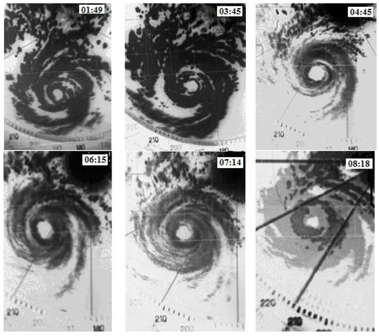 Additional qualitative information about the intensity of a cyclone can also be obtained by observing of the configuration of the TC eye. As shown in recent studies (e.g., [5,7,9,10]), the intensification of TCs is accompanied by irregular polygonal eye configurations. The same was observed in the TC being discussed. Six polygonal eye samples are presented in Figure 4. From Figure 1 and Figure 4, it follows that the polygonal eye shape appeared both during the first intensification (the image at 02:15 LT in Figure 1 and images in the upper row from 1:48 to 4:45 LT in Figure 4) and the second one (images in the lower row from 6:15 to 8:13 LT in Figure 4). In the latter case, a rather rare triangular eye shape was observed at 8:13 LT, before the TC dissipation. Thus, both intensification events identified by the HLS approximation of SCRBs are also confirmed by the reported qualitative characteristics of the TC eye shape. The TC eye configurations were determined by the radar at the same altitude as the SCRB location, which was used to determine the HLS wind.