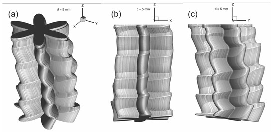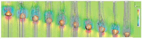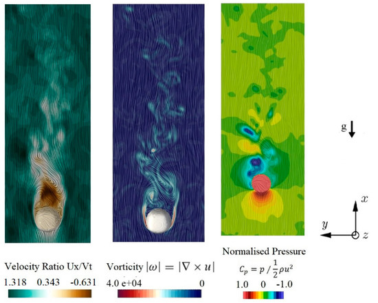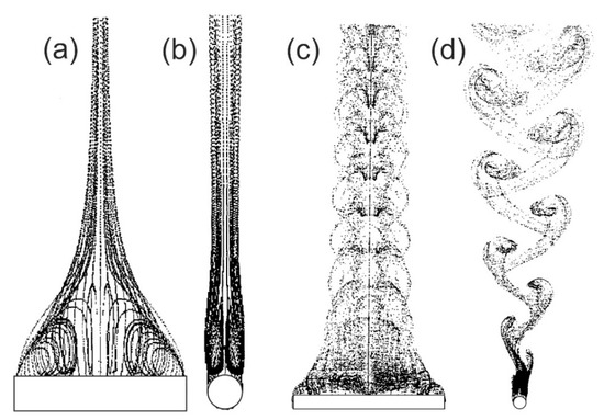 - Taneda, S. Experimental investigation of the wake behind a sphere at low Reynolds numbers. J. Phys. Soc. Jpn. 1956, 11, 1101–1108. [Google Scholar] [CrossRef]