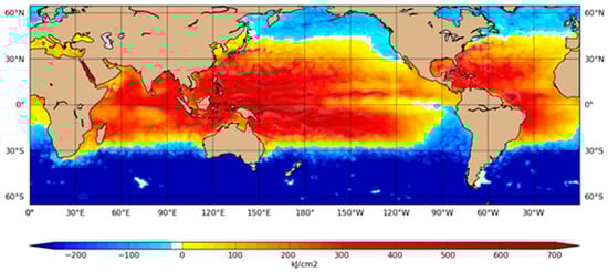 Because the sea water temperatures are less than the 26 °C reference temperature in Equation (1), the heat content has negative values relative to sea water in regions above that temperature. In very cold water we limit the negative heat values to −240 kJ cm−2 for display purposes only.
