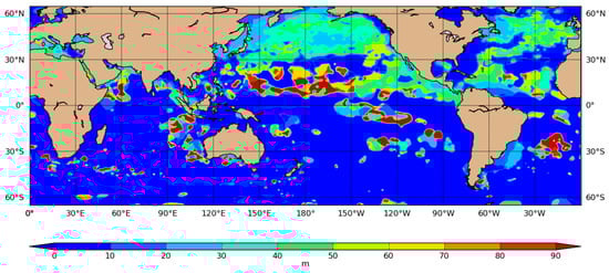 To provide a continuous value of OHC over the entire analysis region, we use a slightly different definition of the heat content of the ocean in those regions where the isotherm outcropping occurs. We use the same vertical integral as Equation (1), but applied over a layer defined as the level where the temperature difference from the surface is less than 1.0 °C.