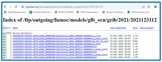 The metrics defined in the previous section have been derived using NCODA analyses produced by the Fleet Numerical Meteorology and Oceanography Center (FNMOC). NCODA is run twice daily (00 and 12 UTC) in operations, and fields are then posted for public use on the GODAE server (https://usgodae.org/index.html, accessed on 22 August 2022). The GODAE server only retains a subset of the parameters described in this work. At the time of this report, six of the variables discussed here are available in near real-time at ftp://www.usgodae.org/ftp/outgoing/fnmoc/models/glb_ocn/grib/ (accessed on 22 August 2022), and an example of a run is shown in Figure 14. The GODAE GRIdded Binary or General Regularly distributed Information in Binary form (GRIB) format repository of all six metrics extends from 2020 through the writing of this manuscript while three of the metrics (SST, OHC26 and Depth of 26 °C Isotherm) extend back through 2014.