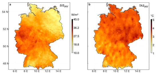 The inter-annual variability SISIAV (Figure 2a) shows a greater variability of SIS than the long-term trend SIST. In the western parts of the study area, SISIAV exceeds 45 W/m2. SISIAV decreases towards the east and northeast and fluctuates there in the range of 20–35 W/m2. In the south, there is an area stretching west-east where SISIAV is lower than in the surrounding areas. Here, in the Danube basin, SISIAV is noticeably reduced compared to the surrounding areas. Near the northern coasts, the annual SIS variability is lowest, with SISIAV values usually fluctuating in the range of 17–25 W/m2. The mean and standard deviation of SISIAV is 34 ± 5 W/m2.