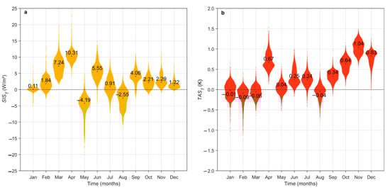 The violin plots for TAST shown in Figure 3b were calculated using the same method as those violin plots of SIST shown in Figure 3a. The long-term monthly grid cell values of the TAST trend also show conspicuous values in two periods of the year (Figure 3b). April shows a noticeable long-term mean increase of TAST = 0.8 K/10 yr. From August to December, TAST values increase continuously up to 1.0 K/10 yr. For April, another study found similar TAS trend values of 0.5 K/10 yr for the north and 0.2 K/10 yr for the south of Germany [5]. The phenomenon of TAS increase in late summer and early autumn has already been reported earlier [30].
