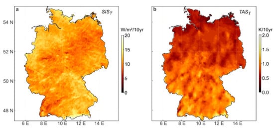 Figure 1b shows the TASP pattern in the study area. Remarkably high values occur in the Upper and Lower Rhine Area at more than 12 °C. These areas are particularly favored in summer by the inflow of warmer air masses from the southwest. Due to the more continental influence with low cloud cover especially in summer, the area of Eastern Germany shows slightly increased values of just about 10 °C. The urban heat islands of Hamburg, Berlin, Halle/Leipzig, and Munich are obvious. Furthermore, the elevations of the low mountains in Central and Southern Germany (Harz, Thuringian, and Bavarian Forest, as well as the Swabian Alb) are recognizable by low annual average values of about 4 °C. The long-term change in annual mean values of SIS (SISA) in Germany is positive but non-significant (Figure 1c). Their total change SIST is 2.4 W/m2/10 yr. This result fits well with trends based on surface measurements in Central Europe reported in another study [26]. The relative standard deviation of SISA equals 3.9%, corresponding to an absolute value of 4.9 W/m2. This matches with the findings of [27] who found a SISA variation with a relative standard deviation of 4–6% in most parts of Central Europe. A study of the spatiotemporal SIS variability over the Eastern Mediterranean in 1983–2013, using data records of SIS from the same source as used in this study, found a positive (brightening) and statistically significant SIST at the confidence level α = 95% with 2 ± 0.05 W/m2/10 yr, with on- and offshore being almost equal [28].