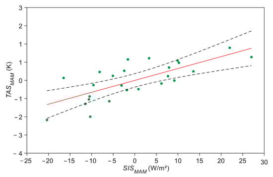 Since Figure 3 shows the most striking trend in SIS and to some extent also in TAS in spring, the seasonal anomalies of SIS (SISMAM) and TAS (TASMAM) in spring are shown in Figure 5. Increasing SISMAM coincides with an increase in TASMAM. In addition to the correlation between SISMAM and TASMAM, the fluctuations of SISMAM and TASMAM within the study period were investigated. It was found that large fluctuations of SISMAM are associated with large fluctuations of TASMAM. For Europe, a correlation coefficient between R = 0.73 and R = 0.86 was found in [2]. Especially for the years from 1990 onwards, the authors calculated high correlation values for the summer months.