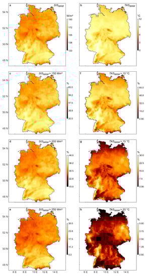Seasonal means of (a) SIS (SISMAM) and (b) TAS (TASMAM) in spring (MAM). Share of events where SISMAM or TASMAM at each grid point is greater than (c) 150, (d) 200, (e) 250 W/m2, and (f) 10, (g) 15, (h) 20 °C in Germany from 1991–2015.