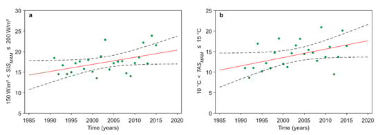 Additional information on the long-term increase of SISMAM and TASMAM can be obtained by studying the increase in the number of events in individual SISMAM and TASMAM ranges. Due to the development of solar energy applications over recent years, there is an increasing need to study the transition of SISMAM and TASMAM to higher levels. Therefore, the long-term change in the number of events in the SISMAM range of 150–200 W/m2 and in the TASMAM range of 10–15 °C is displayed in Figure 7. The trends of SISMAM and TASMAM significantly increase.
