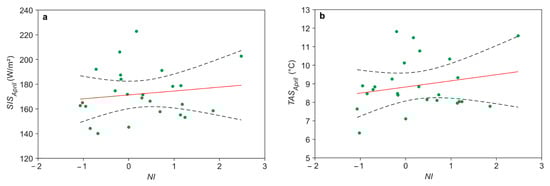 Change in (a) SISApril (ΔNI/ΔSISApril = 3.16, = 0.021) and (b) TASApril (ΔNI/ΔTASApril = 0.33, = 0.05) in dependence on the NAO index (NI) in April in Germany 1991–2015. The black dashed lines indicate the 95% confidence intervals for the regression model.