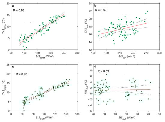 Correlation of seasonal means of SIS and TAS in (a) spring (MAM), (b) summer (JJA), (c) autumn (SON), and (d) winter (DJF) in Germany from 1991–2015. The correlation coefficient (R) is given for each season in the corresponding figure. The black dashed lines indicate the 95% confidence intervals for the regression model.