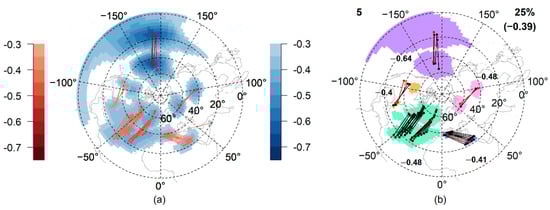 (a) The fields of strongest negative correlations (SNC fields; blue-shaded grid cells) computed from the geopotential height field at the 500 hPa pressure level (zg500), for the period of 1976–2005. Potential action centers are denoted with red-shaded full circles connected with red-shaded lines. Brighter/darker colors indicate weaker/stronger correlations. (b) The map of cluster patterns obtained from the ERA-20C for the period of 1976–2005 (reference CP map) in accordance with [34] and Figure 2 therein. For the better visualization, clusters are denoted with different colors. The amount of the clusters is texted on the top-left corner of the map. Potential action centers are denoted with black dots connected with black lines, while the action centers are highlighted with red. The correlation associated with the action centers are texted on the map. The percentile and its associated correlation value can be seen in the top-right corner of the map in parentheses.