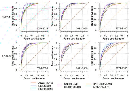 The receiver operating characteristic (ROC) curves obtained from the GCM simulations under the RCP4.5 and the RCP8.5 scenarios, for the periods of 2006–2035, 2021–2050, and 2071–2100. The dashed straight lines represent the 45° line.