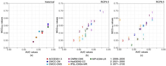 The area under curve (AUC) values and the largest values of the Matthews correlation coefficient (MCCmax) (a) for the historical GCM simulations (data are provided in Table A1), (b) for the RCP4.5 simulations, and (c) for the RCP8.5 simulations (data are provided in Table 2). The GCMs are denoted with colored symbols in all the three plots. In (b,c) the symbols are replaced with numbers, where 1, 2, and 3 indicate the analyzed 30-year-long time periods. Black asterisks denote the mean values (in (a) AUC = 0.91, MCCmax = 0.56, in (b) AUC = 0.88, MCCmax = 0.58, in (c) AUC = 0.87, MCCmax = 0.58), while gray asterisks denote the median values (in (a) AUC = 0.91, MCCmax = 0.56, in (b) AUC = 0.87, MCCmax = 0.57, in (c) AUC = 0.88, MCCmax = 0.6).