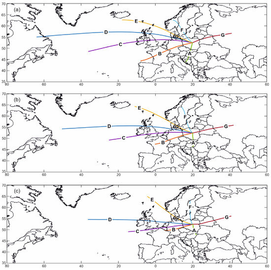 Averaged 72-h backward trajectories in 7 clusters ending at the grid point 52.5° N, 20° E at 12:00 UTC at the following heights: 3000 m above ground level (a), 1500 m above ground level (b), 500 m above ground level (c), during the period 1986–2015.