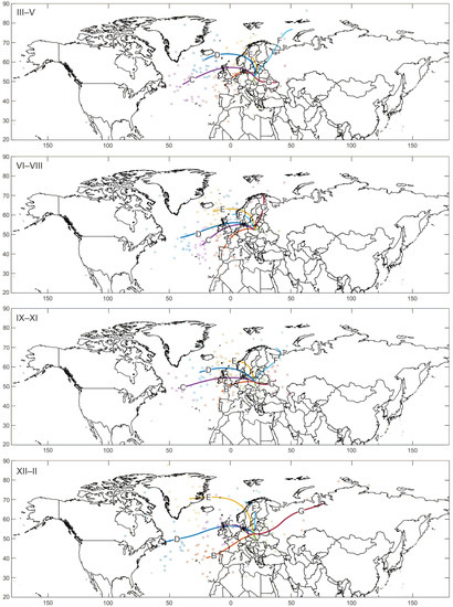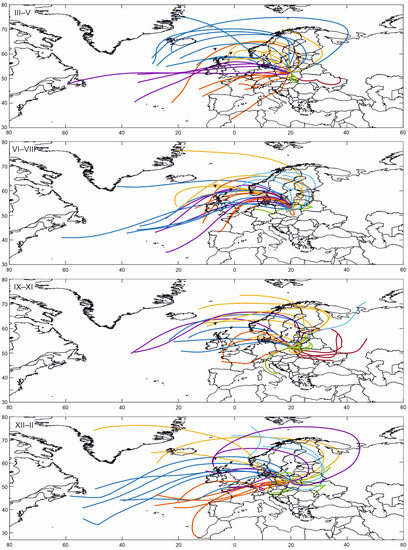 The division into clusters and averaged air mass inflow paths over Poland in individual seasons of the year are very similar to the division into clusters of data from the entire multi-year period. However, it should be noted that in summer the air moves slower, and the starting points of backward trajectories are more concentrated geographically: most of them are located between meridians 70° W and 50° E (Figure 3). On the other hand, in winter a positive phase of the North Atlantic Oscillation occurs more often and strengthens zonal circulation [48,49], which results in the air flowing over Poland from very distant locations: the starting points of backward trajectories are located between meridians 100° W and 100° E.