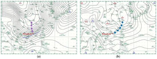 Located in the subtropics and bordered by mainland China and the South China Sea, Hong Kong has distinct monsoon seasons throughout the year. When cold outbreaks over northern China are sufficiently intense, the winter monsoon may further advance southwards and reach the coast of southern China along two major paths: (a) southward crossing the central part of China, the Nanling ranges and landmass of southern China; or (b) south and then turning south-westward, traversing the coastal regions of southeastern China including coastal waters. The two types of monsoon flow are named northerly surge and easterly surge in Hong Kong, respectively, where local winds increase from the north and the east upon the arrival of the surge. Figure 1 shows the typical surface pressure patterns for northerly and easterly surges. The former shows a large pressure gradient over southern China, prompting significant isallobaric flow and very effective cold advection from north to south. The latter shows a ridge feature along the coast of southeastern China; cold advection along this path is less effective as the flow is moderated by warmer sea surface along its path. Significant temperature drop associated with surge arrival over inland China and Hong Kong is usually due to northerly surges [5,8,9].