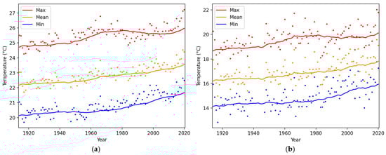 Long-term variations of HKO’s daily maximum, mean and minimum temperatures (expressed in red, orange and blue colors, respectively) calculated by averaging over the periods of interest: (a) all days in a year; and (b) all days in cool months. The corresponding color trend lines represent the 30-year running averages of the three temperature parameters and the dots represent the value in a specific year. Based on records at HKO Headquarters from 1884 to 2020 (data not available for 1940–1946). The calendar years on the horizontal axis refer to the ending years of each running 30-year periods with the first data point plotted at 1914.