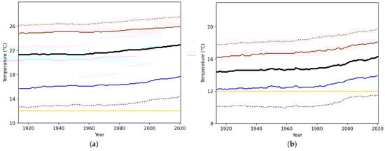 30-year running percentiles of DMT as represented by the key percentiles, including the 10th (blue dotted), 25th (blue solid), 50th (black solid), 75th (red solid) and 90th (red dotted) percentiles over the periods of interest: (a) all days in a year and (b) all days in cool months. Data range and plotting convention are same as those in Figure 2. The horizontal yellow line marks the threshold temperature at 12.0 °C for cold weather.
