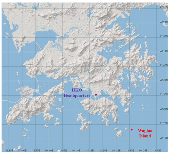 The location of HKO Headquarters (purple) and Waglan Island (red). (Background topography: Open Street Map, openstreetmap.org).