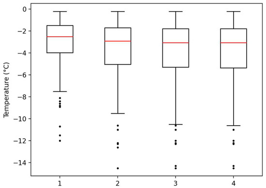 Box-and-whiskers diagram of temperature change with n = 1, 2, 3 and 4 of all cold events.