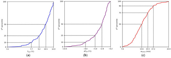 The cumulative distribution of the three indicators and with their important percentiles are given in Figure 7 and Table 5. It can be observed that very cold weather was so rare in the set of cold events that even the 10th percentile of could not even reach 7.0 °C or below. In fact, multiple very cold days fell into the same event; for example, there were 3 very cold days in the so-called “super cold surge” in late January 2016. In addition, the 90th percentile of is close to the threshold of our operational definition of gale force winds (17.5–24.4 m/s). The values of upper (lower) quartile plus (minus) 1.5 times inter-quartile range (IQR) are also given in Table 5, as this is a statistical measure of outliers [30] and could potentially indicate that the surge is extremely severe when one or more of these values are reached.