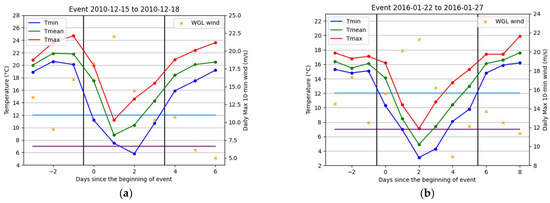 Two cases classified as “extreme cold surge”: (a) time series of the cold event on 15–18 December 2010 and (b) the other on 22–27 January 2016. The start day of each event was labelled as Day 0. The daily (local time) minimum, mean and maximum temperatures were represented in blue, green and red dots, respectively. The daily maximum 10-min wind records at Waglan Island were marked as orange crosses. The horizontal light blue and purple lines indicate the thresholds for “cold” (12.0 °C) and “very cold” (7.0 °C) days, and the two black vertical lines confine all data points within the event for easy appreciation. For the two cases, (, , ) were (a) (5.8 °C, −12.6 °C, 22.0 m/s) and (b) (3.1 °C, −8.1 °C, 21.3 m/s), respectively.