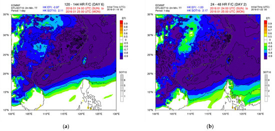 Forecast ensembles and model climate may play an important role when assessing the extremity of an anticipated cold event when such are well-calibrated with respect to the local climatology. Based on the European Centre for Medium-Range Weather Forecasts (ECMWF) model, the Extreme Forecast Index (EFI) [36] and Shift of Tail (SOT) are measures of ensemble members’ extremity in terms of the model climate of a specified 5-week period close to the calendar date of the forecast [37]. For EFI and SOT of 2 m minimum temperatures, an EFI closer to −1 and Shift of Tail Index for the 10th percentile (SOT10) being more positive imply that more extreme coldness is forecast. Take four recent intense cold events in 2016, 2018, 2020 and 2022 as examples. The event in 2016 was an extreme cold surge whereas the rest were less extreme, satisfying only the thresholds of = 25. From Table 8, it appears that the more extreme the cold events, the more extreme the corresponding EFI (closer to −1) and SOT10 (more positive) are. In fact, the extreme cold surge in 2016 scored EFI effectively −1, with SOT10 reaching about 2 or beyond. Models were seen to have rather stable and persistent performance in terms of the values of EFI and SOT10 across different model runs for all three events. The EFI and SOT10 forecasts of these events were also quite stable from a spatial perspective; Figure 13 showed that the area of extreme EFI and SOT10 for minimum temperature sat over similar regions of southern China and the northern part of the South China Sea with 1-day and 5-day lead time in the extreme cold surge in 2016.