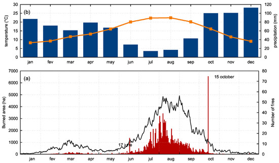 (a) Daily mean values of the number of fires (black solid line) and burned area (red vertical lines) in the period of 1980–2018. The peaks on 17 June and 15 October are mainly due to the exceptional contribution of 2017. (b) Monthly average values of air temperature (orange line) and total precipitation (blue columns) over mainland Portugal (163 grid points) based on 30 years of ERA5 reanalysis (1981–2010). For details on data, see Section 2.