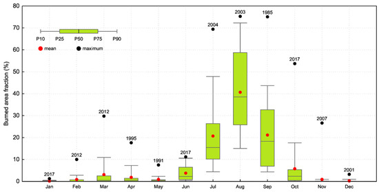 Distribution of the monthly fraction of annual burned area in the period of 1980 to 2018, indicating the 10th, 25th, 50th, 75th and 90th percentiles (box and whisker plot), the mean (red dots) and the maximum monthly values (black dots labeled with the year of occurrence).