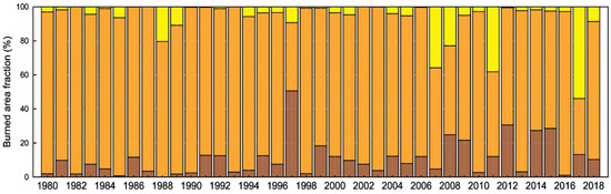 The monthly distribution of the annual burned area in Portugal shows a broad concentration in July, August and September (Figure 3). These three summer months account, on average, for 82.5% of the total area burned each year. However, the monthly data also show an increase in the proportion of the annual burned area that occurred outside of those three months from 1980 onwards (Figure 4). In fact, there is a meaningful increase in the fraction of burned area occurring in the period of January to June, whereas the fraction of July to September shows a decreasing trend (both Mann–Kendall test with ρ < 0.01). Regarding the fall, i.e., October to December, the trend is not significant at the 99% confidence level (trend analysis summary in Table S1).