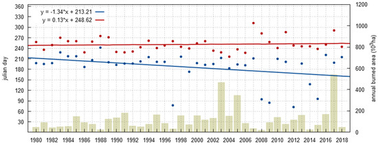 Evolution of the dates on which the 15% (blue points) and 85% (red points) fractions of the total annual burned area were exceeded in the period of 1980–2018, and corresponding adjusted linear regressions. Gray bars show the annual burned area.