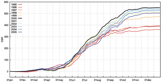As a sensitivity test to these results, we studied the effect on the DSR difference curve produced by shifting the partition of the study period from 1994/95 (which generates the 1980–1994 and 1995–2018 periods) to 2004/05 (which generates 1980–2004 and 2005–2018). As shown in Figure 8, the split used in this study (1980–1999 and 2000–2018) maximizes the difference in the cumulative DSR by the year’s end, while being based on a balanced split of the study period (20 and 19 years, respectively). It is important to note that, regardless of the year of partition, the most recent period always shows an increased level of severity of the DSR.