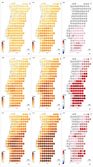 There is a slight increase of 2–5 days in the average number of “dangerous” days in May in the central/southern regions, which is absent in March and April (Figure S1). The magnitude of the increase is larger and expands northeastward during June, resulting in about 1/3 of the country having high fire danger for half a month (13–17 days). In June, in some areas of the grid, the number of days with the potential for extreme fire behavior more than doubles. In the following month, July, there is also an important increase in the number of high-danger days, although it is smaller compared to June. These results show the inclusion of June in the most critical months and the aggravation, to a lesser extent, of high fire danger in May.