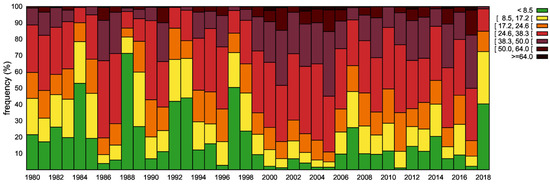 Interannual variation in the average frequencies by FWI danger class in the month of June between 1980 and 2018. The classes shown are currently used by the meteorological and fire management authorities of Portugal [57,58] (p. 231): <8.5, [8.5, 17.1], [17.2, 24.6], [24.7, 38.3], [38.4, 50.0], [50.1, 64.0], >64.