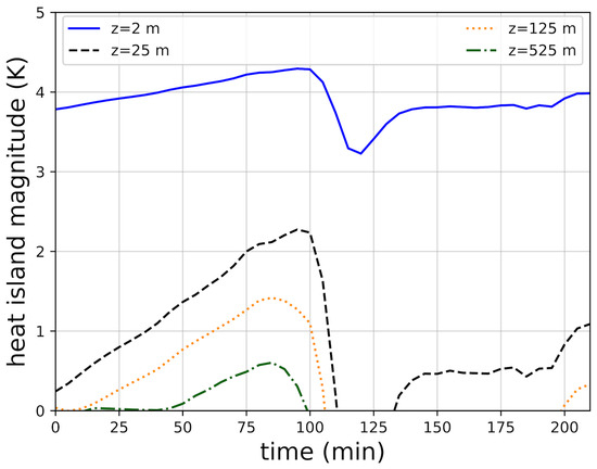 The time-series of heat island magnitude at different vertical levels in the city simulation. Heat island magnitude is calculated as the difference between the average temperature within the idealized city at a particular level and the temperature of the far field at the same level.