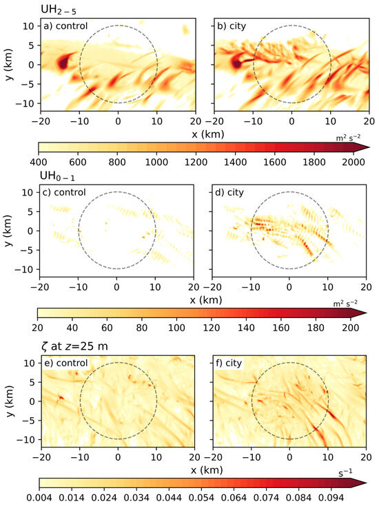 Swaths of 2–5 km updraft helicity (a,b), 0–1 km updraft helicity (c,d), and vertical vorticity (; e,f) at the lowest model level. The 0–1 km UH values are filtered based on a 2–5 km UH threshold of 150 m2 s−2. The dashed gray circle represents the location and extent of the simplified city. For the control simulations (a,c), the areal extent of the simplified city is simply shown for reference.