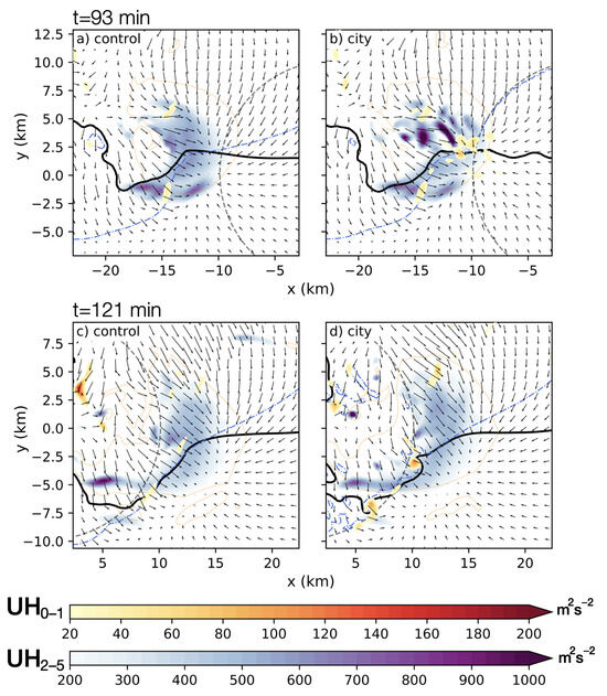 Overview of the storm structure at t = 93 min (top) and t = 121 min (bottom). The solid black line is the 2 g kg−1 contour of the rain water mixing ratio at z = 25 m, the dashed blue line is the −1 K potential temperature perturbation at z = 25 m (to estimate the storm gust front), the thin, dashed orange line is the 10 m s−1 contour of vertical velocity at z = 6 km, and the arrows represents the wind vectors at z = 25 m. The filled cool colors are 2–5 km updraft helicity and the filled warm colors are 0–1 km updraft helicity. Values are filtered to only show 0–1 km UH values at the grid points with 2–5 km UH greater or equal to 150 m2 s−2. The dashed gray circle represents the location and extent of the idealized city.