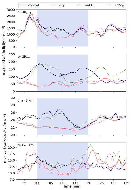 To further examine which aspects of the simplified city are most responsible for the observed variations in low-level mesocyclone strength, two additional simulations are presented for comparison to the city and control simulations. In one simulation (herein referred to as the “noUHI” simulation), the simplified city does not produce a heat island but still represents an area of enhanced surface roughness length. In the second simulation, (herein referred to as “no”), a heat island is present but the surface roughness length is not enhanced over the simplified city. At midlevels, UH2−5 is similar among all four simulations prior to t = 100 min (Figure 9). The supercell in each of the four simulations experiences a local maximum of over 2500 m2 s−2 at approximately t = 97 min. After this time, UH2−5 decreases in all simulations; however, the decrease between t = 100 min and t = 115 min in noUHI more closely aligns with the control simulation, while the decrease in no closely resembles that of the city simulation. The city and no simulations have values of UH2−5 that are occasionally more than double those in control and noUHI. After t = 115 min, UH2−5 in the four simulations exhibits a similar cyclic pattern with the noUHI simulation tending to have slightly larger values than the other three simulations. Closer to the surface, UH0−1 in the noUHI simulation is substantially less than in the city simulation from t = 100–120 min and follows a pattern that is very similar to that of the control simulation, whereas no closely resembles the city simulation (Figure 9b). While passing over the simplified city, the maximum low-level vertical velocity values in the control and noUHI simulations are less than those in the city and no simulations (Figure 9c,d). This is almost assuredly due to the enhanced CAPE values in the city (Figure 6d) and no simulations (not shown). NM23 have previously shown that air parcels originating over a heat island with enhanced CAPE are ingested by the convective updrafts leading to enhanced buoyant acceleration.