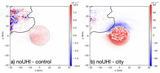 Difference in 0–1 km SRH at t = 75 min between (a) noUHI and control and (b) noUHI and city. The solid black line is the 2 g kg−1 contour of the rain water mixing ratio at z = 25 m in the noUHI simulation and the dashed gray line represents the horizontal extent of the idealized city.