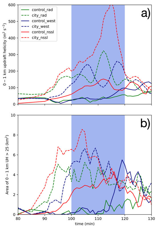 The time evolution of maximum updraft helicity is impacted by the presence of the city, with differences between the two simulations being more prominent near the surface (Figure 5). At midlevels, UH2−5 is identical until approximately t = 90 min. Around t = 98 min both supercells experience an increase in UH2−5 to over 2500 m2 s−2. Over the next 20 min, UH2−5 declines in both simulations but a maximum UH2−5 in the city simulation remains larger in comparison to the control while passing over the simplified city. After t = 120 min, both supercells have comparable patterns in UH2−5. Larger differences are seen in UH0−1 (Figure 5b). Between t = 60 min and t = 80 min, UH0−1 in both supercells begins to increase. As the supercell in the city simulation approaches the western edge of the simplified city, UH0−1 abruptly jumps to nearly 200 m2 s−2 and remains over 100 m2 s−2 as the primary circulation passes over the simplified city. In contrast, UH0−1 in the control simulation remains less than 75 m2 s−2 during this same time period. After t = 120 min, at which point the supercell in the city simulation has completely left the simplified city, UH0−1 values decrease to those seen in the control simulation. Not only are maximum values of UH0−1 greater in the city simulation while the supercell passes over the simplified city, but the overall area of larger UH0−1 is amplified as well (Figure 5c). Between t = 100 and t = 120 min, the area of a larger UH0−1 in the city simulation is more than triple that in the control simulation. After this time, the area of UH0−1 rapidly decreases in the city simulation and follows a similar pattern to control for the remainder of the simulation.