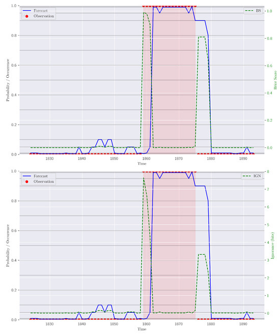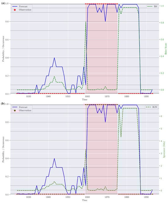 Time series of forecasts (blue solid line) and observations (red circles at 0 and 1). The red colour-fill indicates the period during which the rare event is observed, where the x-axis is non-dimensional timesteps. The verification score (green dotted line) per timestep evaluates the old model against observations: panel (a) uses the Brier Score (unitless); panel (b) uses Ignorance, in bits.