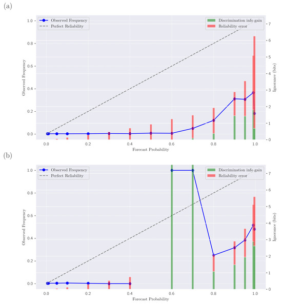 Uncertainty is inextricable; in contrast, REL and DSC components can be optimised, but potentially with one at the expense of the other. This parallels the “Doppler dilemma” [49], where Doppler radars must balance increasing pulse-repetition frequency with a consequent reduction in the maximum unambiguous range. In NWP ensembles, a set of members perturbed from a “best guess" (the control or a deterministic run) may yield fewer skillful ensemble members but a better overall probabilistic prediction. In an underdispersive prediction system (i.e., too confident in a smaller range of future states), events occurring at the tail of the underlying climatological distribution are less likely to be adequately detected. This limits the forecast utility when risk thresholds are critical for decision-making and loss mitigation. However, when confidence is spread quasi-uniformly across a wide range of outcomes, the recipient cannot move far from their prior expectation probability with a wide spread of eventualities. The use of DSC and REL components to evaluate probabilistic-forecast performance is found in [50,51,52], amongst others.