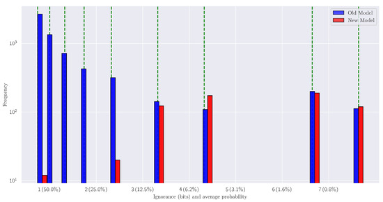 Histogram distribution of ignorance remaining (in bits) after each forecast for the old and new models, where only bins exceeding 0.7 bits are included to ignore the large proportion of near-zero-error forecast–observation pairs.