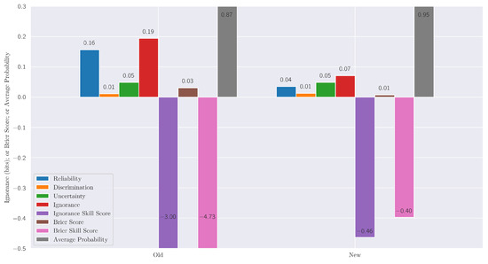 Components of ignorance for old and new models, with Brier-type scores for comparison. Information gain is represented as the reduction in ignorance (red) by using the new model over the old.