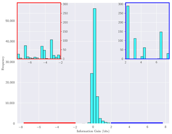 The histogram of information gained or lost by using the new model over the old. The upper-right inset axis, outlined in blue, has a smaller y-axis range, magnifying the histogram of information gain values greater than 2. This zoom is indicated by a blue line on the x-axis. Likewise, information loss greater than 2 bits (negative values less than −2) is shown on a larger scale by the upper-left red-bordered inset.