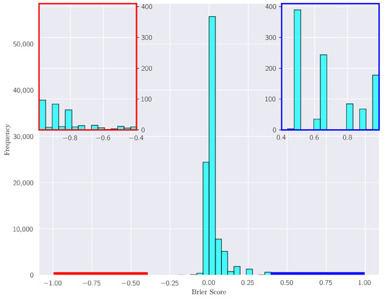 As Figure 7 but for the change in Brier Score , with a magnification of the histogram at values greater than 0.4 and less than −0.4 of .